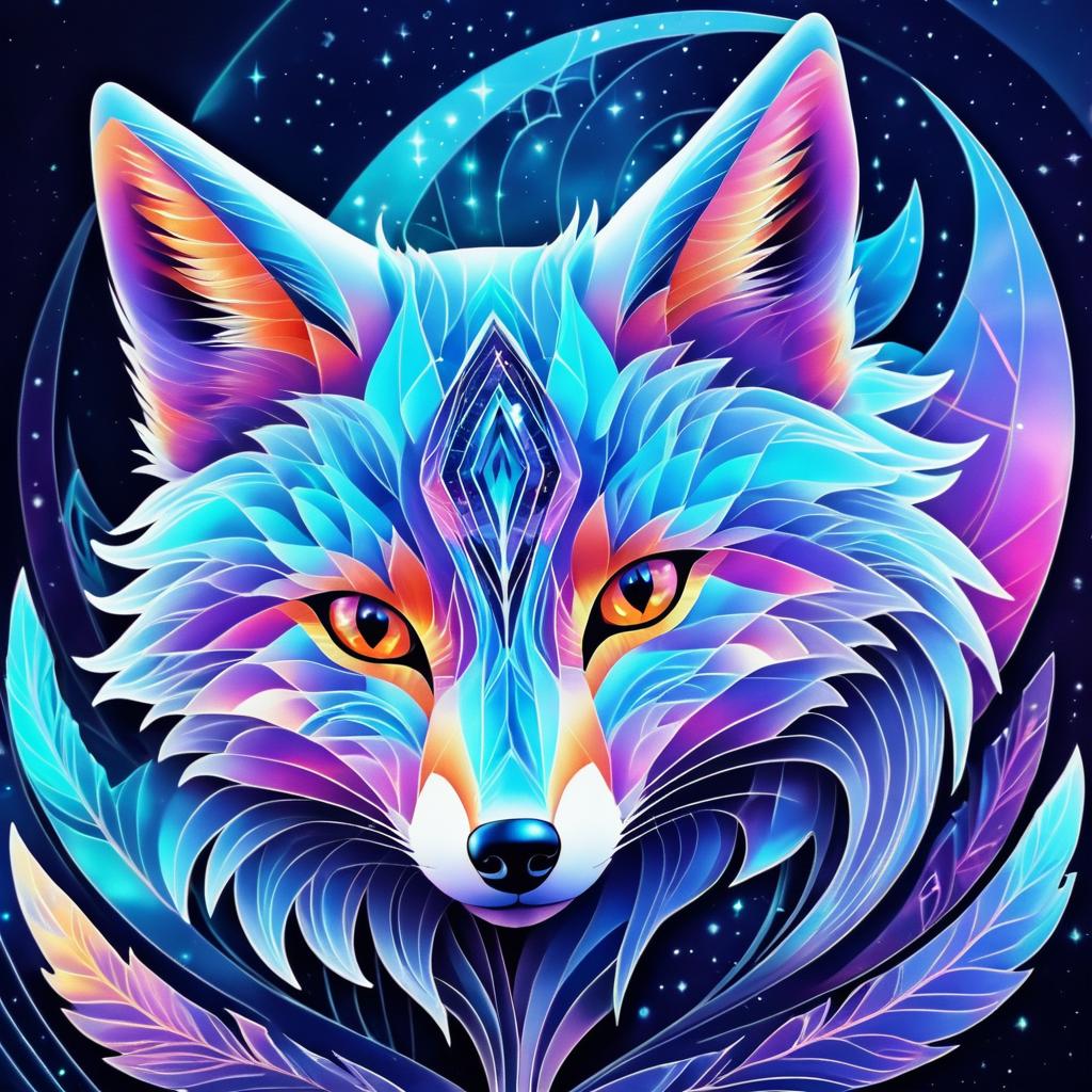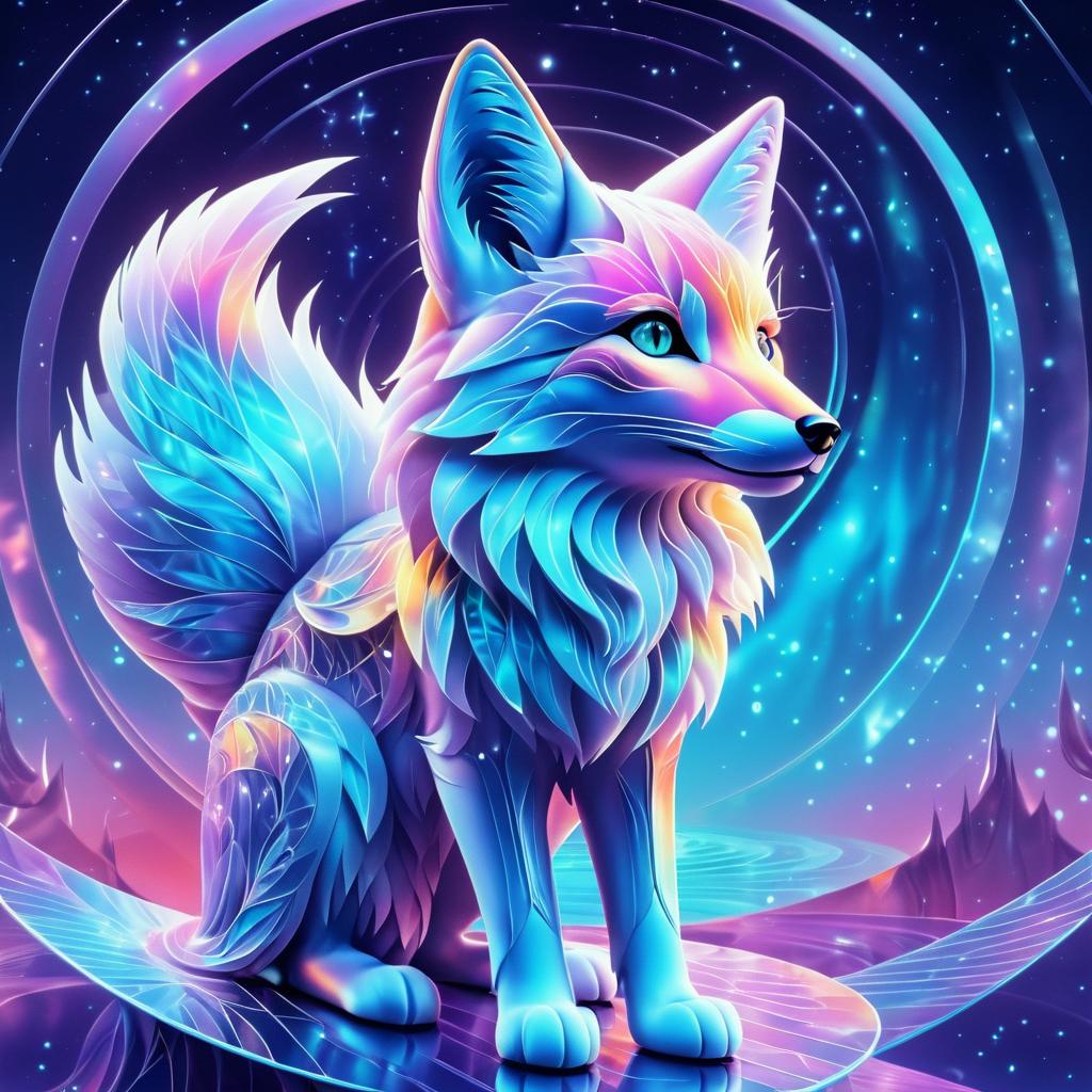 A holographic fox, fantasy illustration with a surreal and futuristic design.