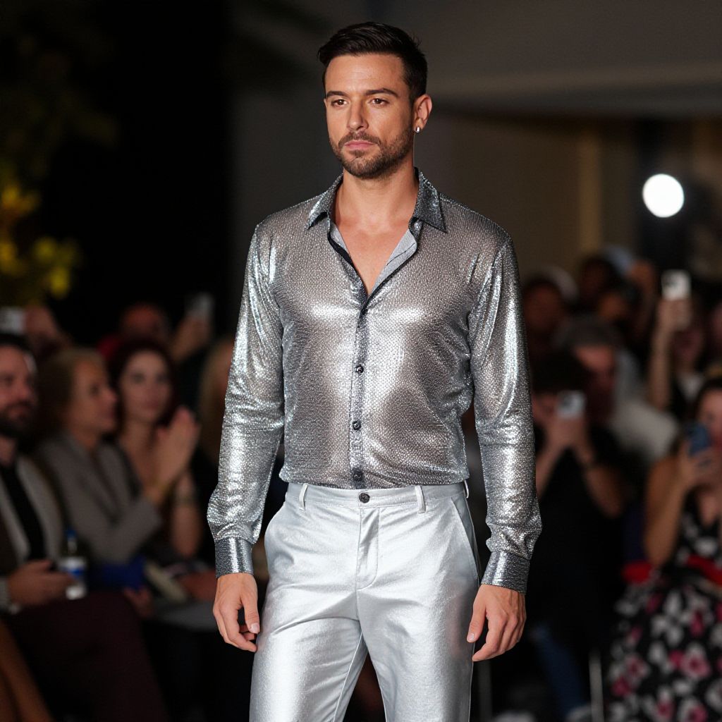 Photograph of a male model walking down a dimly lit runway. He has short dark hair, a trimmed beard, and a serious expression. He wears a shiny, silver, long-sleeve button-up shirt with a textured pattern and silver, high-waisted pants. The background is blurred, featuring an audience with mixed lighting and some visible reflections. The model's outfit contrasts sharply with the darker, more subdued audience. The overall style is modern and fashionable, with a focus on metallic and reflective textures.