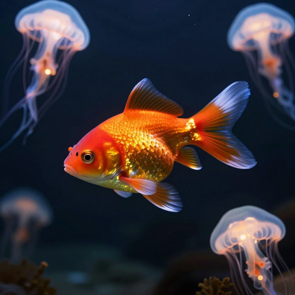 Raichu goldfish hybrid swimming gracefully in a crystal-clear aquarium, glowing golden scales shimmering under soft sunlight, whimsical aquatic environment with vibrant plants and bubbles, fantasy style, highly detailed, vibrant colors, smooth water reflections
