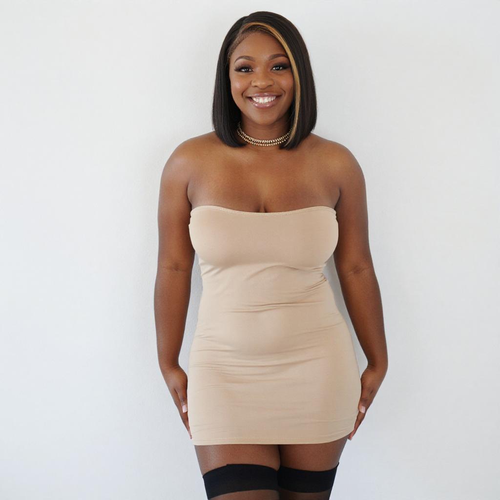 Photograph of a curvy black woman with a bright smile, standing in front of a white wall. She has straight, shoulder-length black hair with a blonde streak on the right side. She's wearing a tight, strapless beige mini dress that highlights her large breasts and wide hips, paired with black thigh-high stockings. She's accessorized with a gold choker necklace. The background is simple and bright, making her the focal point.
