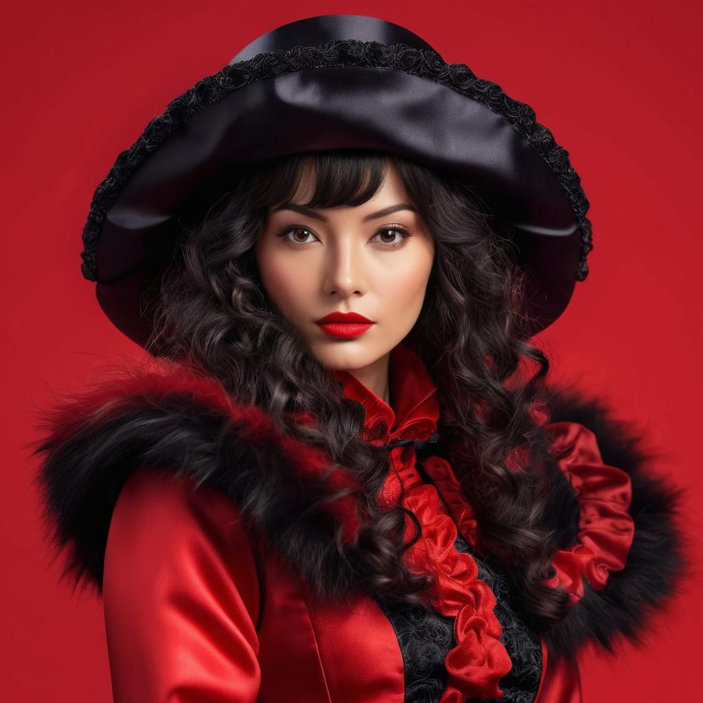This is a digital portrait of an East Asian woman with fair skin and striking red lipstick. She has long, wavy black hair adorned with a black, lace-trimmed hat. Her outfit features a vibrant red satin blouse with black fur trim and red rose embellishments. The background is a solid, intense red, highlighting her elegant and dramatic appearance. Her expression is serious and composed, with dark, almond-shaped eyes looking directly at the camera. The image has a high-contrast, hyper-realistic style, emphasizing her features and the textures of her clothing and hat.