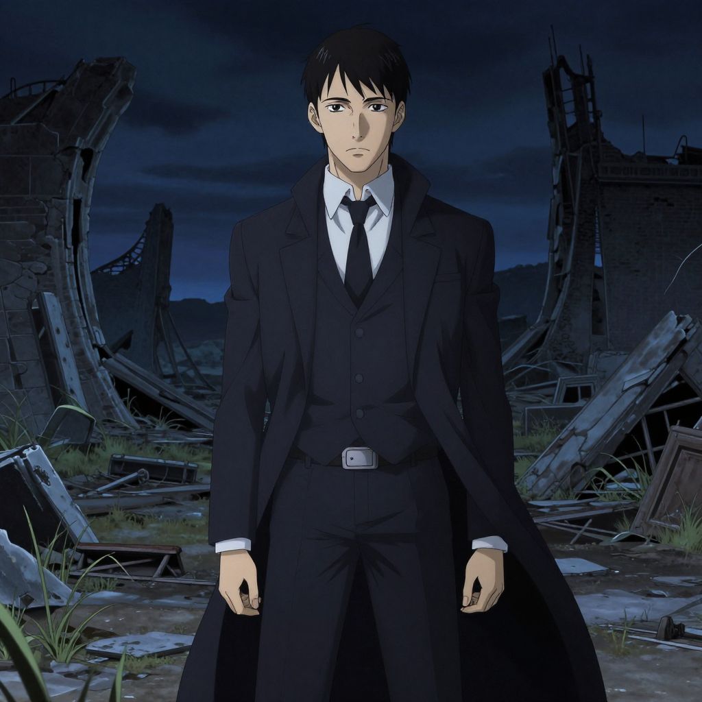 Anime-style drawing of a serious young man in a black suit and tie, standing in a dark, ruined, industrial landscape at night.
