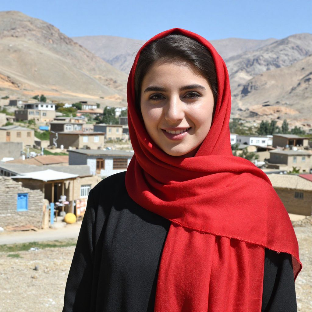 Young Kurdish woman wearing a vibrant red headscarf smiles warmly in a rustic village setting, surrounded by modest houses and rugged mountains near the Syrian border.
