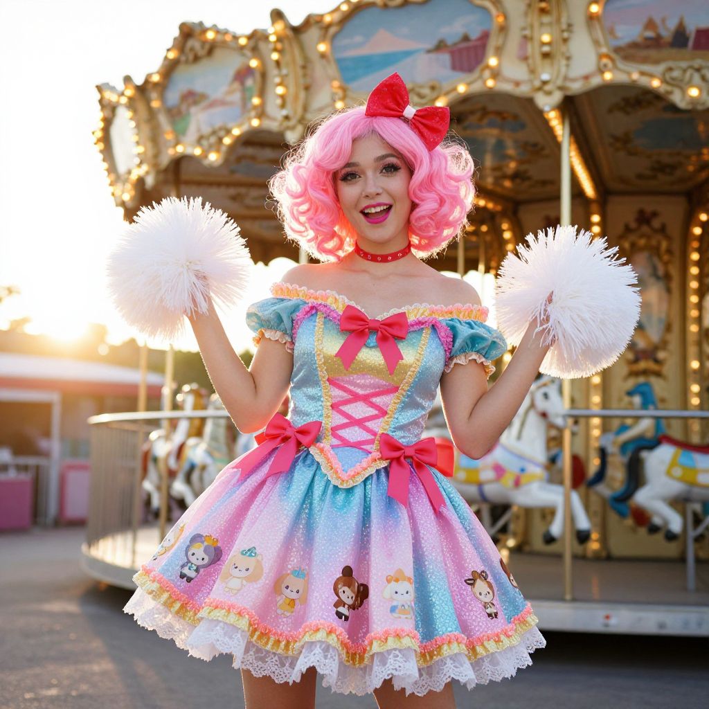 Photograph of a cheerful woman with bright pink, curly wig, and red bow, wearing a colorful, sparkly, off-the-shoulder dress with cute cartoon designs on the skirt. She's holding fluffy white pom-poms and standing in front of a colorful, lit-up carousel at a carnival. The sun sets in the background, casting a warm glow. Her makeup is bold with pink lipstick.