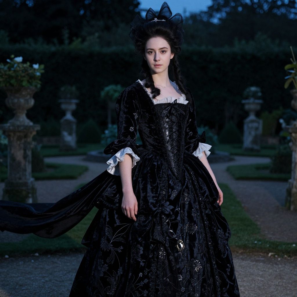 A cinematic portrait of Marie Antoinette in a detailed black velvet costume dress, posing in a moonlit garden of Versailles, with flowing fabric and subtle embroidery, her face serene yet mysterious, with delicate eyes and a refined jawline, the setting reflecting the grandeur and melancholy of her historical persona.