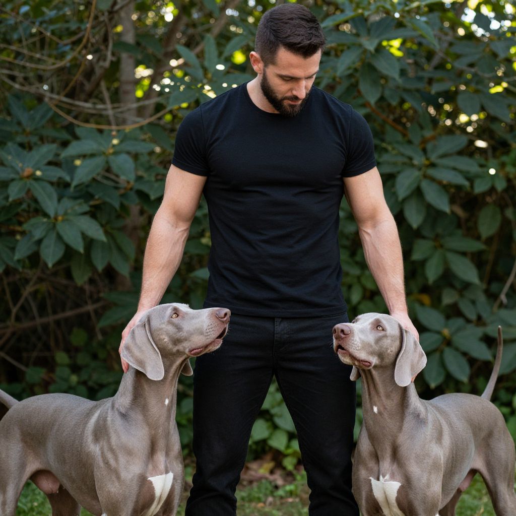 Photograph of a muscular man with short dark hair and a black beard, wearing a tight black t-shirt and black pants. He stands outdoors with two grey Weimaraner dogs, one on each side, both with white stars on their chests. He's gently touching their heads. The background is lush green foliage, with sunlight filtering through the leaves.