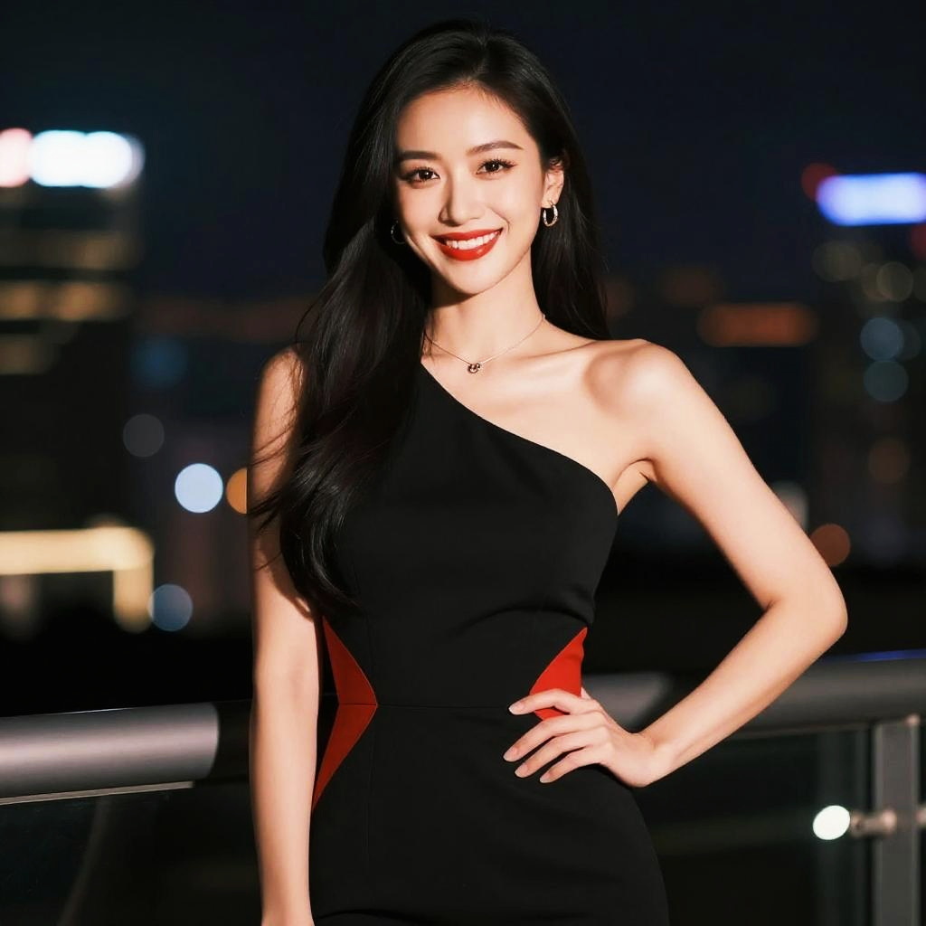 Photograph of an Asian woman with long, wavy black hair and fair skin, standing in a bustling outdoor market at night. She's wearing a black and white long-sleeve dress with a high collar. The background features warm, glowing lanterns and green potted plants. There are blurred figures and market stalls in the distance, creating a cozy, lively atmosphere.