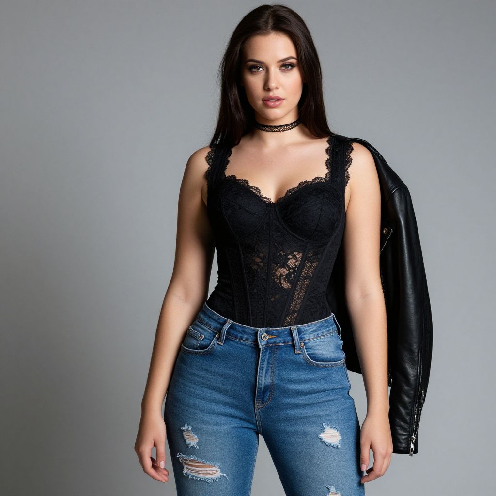 "Woman, edgy, acid-wash sleeveless tank top in a dark grey gradient, raw-cut fringe along the bottom hem, high-waisted black denim shorts with frayed edges and visible pocket linings, wide-brimmed black floppy hat, cuff bracelet on upper arm.. Sexy. Pretty face and beаutiful eyes. Big breasts."