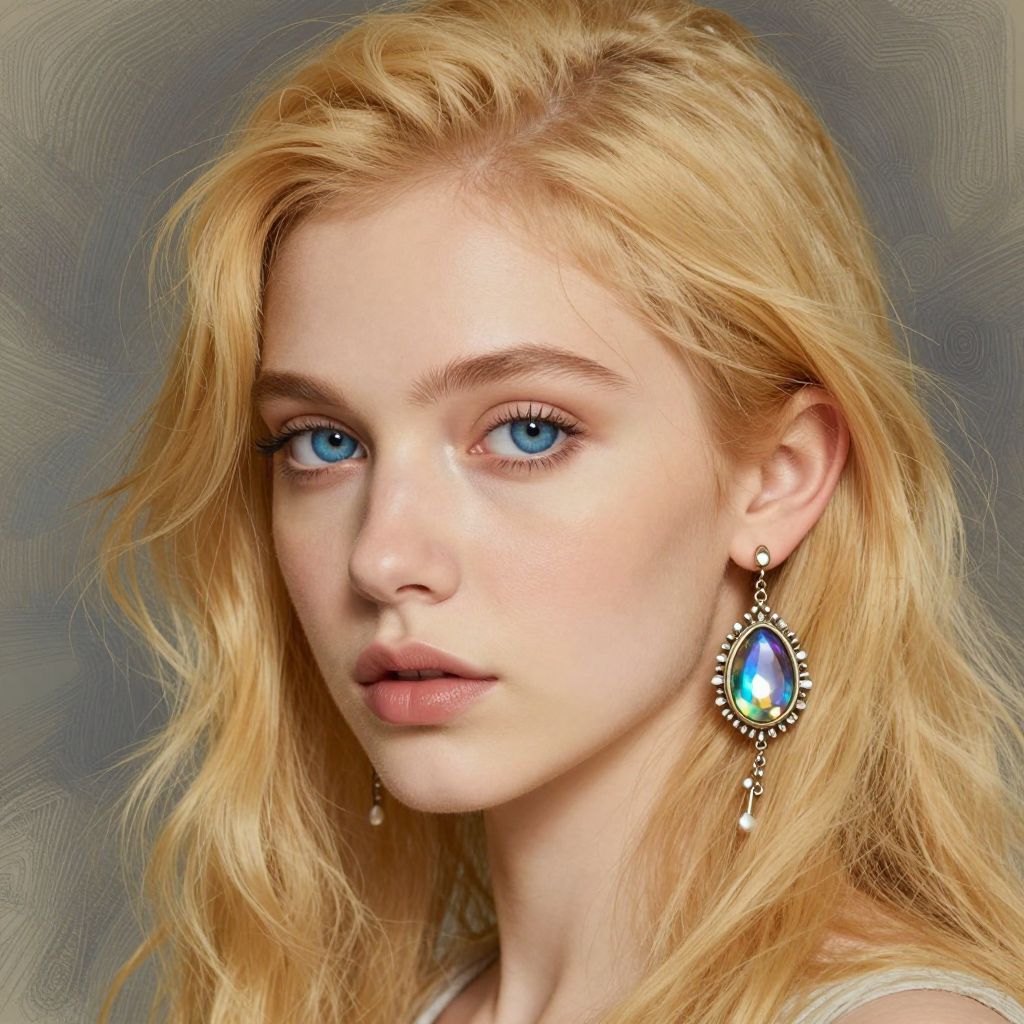 Photorealistic digital portrait of a fair-skinned, blue-eyed blonde woman with wavy hair, wearing a blue gemstone earring, against a