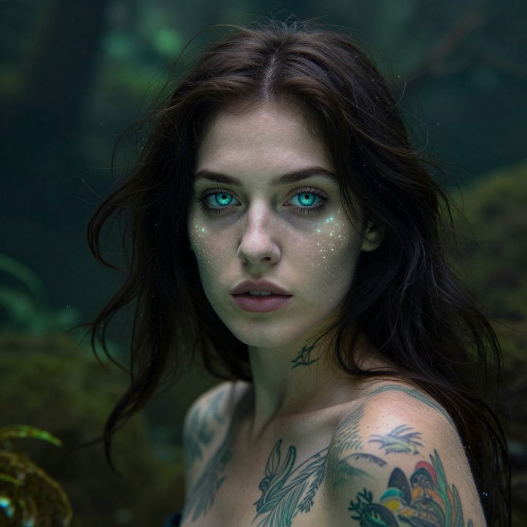 Craft a photorealistic portrait photograph featuring an enigmatic young Mediterranean woman with captivating azure eyes and raven hair. Set against a backdrop seamlessly merging lush forest greenery with mysterious underwater depths, capture her ethereal beauty through a unique perspective that illuminates the delicate tracery of her facial features with bioluminescent light. Showcase intricate tattoos depicting scenes from both terrestrial and aquatic worlds, inviting viewers to explore the tension between nature's splendor and its unknown secrets beneath the surface, all within the captivating realm of this enchanting subject.