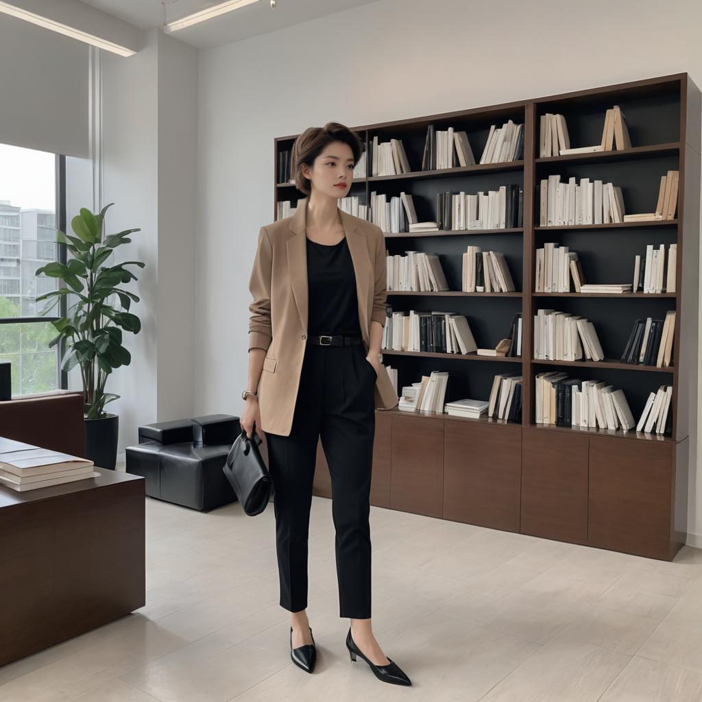 Photo of a Inverted Triangle woman, Messy Updo, minimalist outfit, monochrome palette, neutral tones, sleek lines, tailored Chocolate Brown blazer, white cotton t-shirt, black slim-fit Jet Black trousers, leather Slingbacks, minimalist watch, modern, understated elegance, Serene Library, Elegant Cinematic Scene