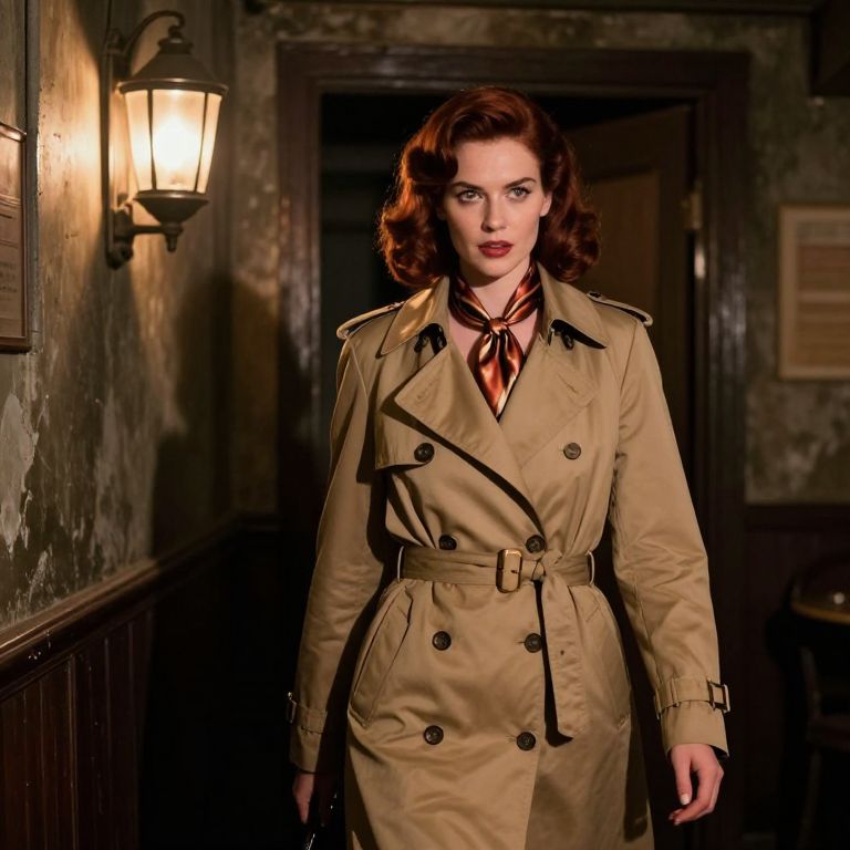 A striking 1930s trench coat heroine with dark auburn hair, high cheekbones, and intense hazel eyes walks through a gritty underground speakeasy, the soft glow of vintage lanterns casting long shadows on the walls, the trench coat slightly open to reveal a vintage silk scarf, her presence radiating strength and mystery as she glances toward a hidden doorway