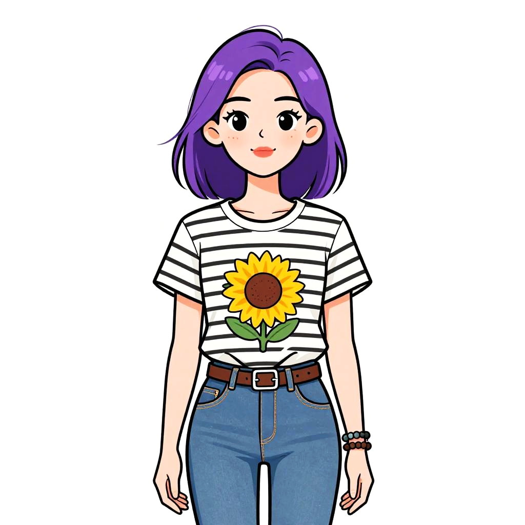 Woman with pretty face and pretty hair. Woman, casual streetwear, white graphic t-shirt with a turquoise starfish print, knotted at the waist, high-rise teal corduroy pants, silver button closure, plain white background. --sref 1467