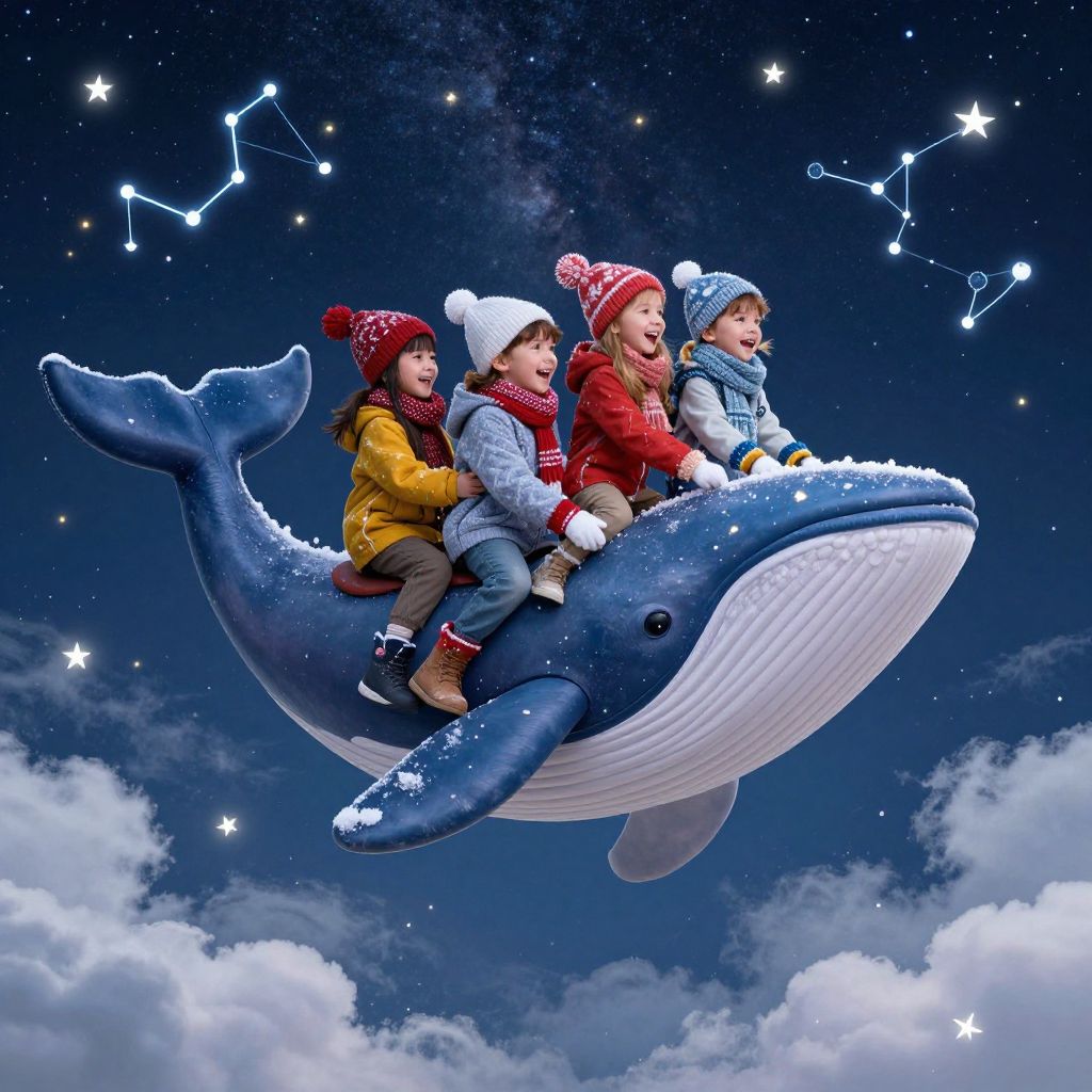 Four children dressed in festive winter clothing joyfully ride atop a large, friendly whale soaring through a starry night sky, surrounded by fluffy clouds and twinkling constellations, embodying the magic of a winter festival adventure.