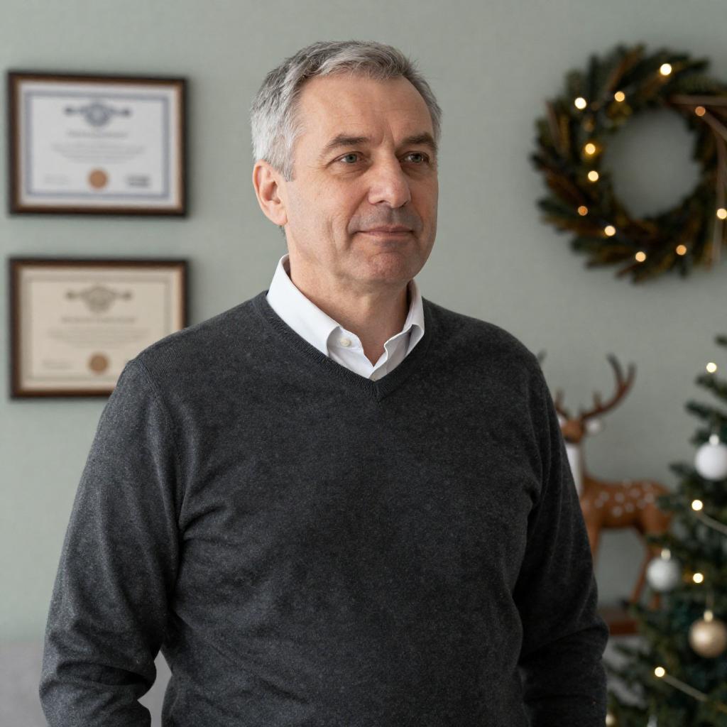 Middle-aged man with short gray hair, wearing a dark gray sweater over a white collared shirt, stands indoors. Background includes two framed certificates on a light green wall, a decorated wreath with lights, a small reindeer statue, and a lit tree. Man has a neutral expression, facing slightly to the right. Bright lights in the background and right foreground.