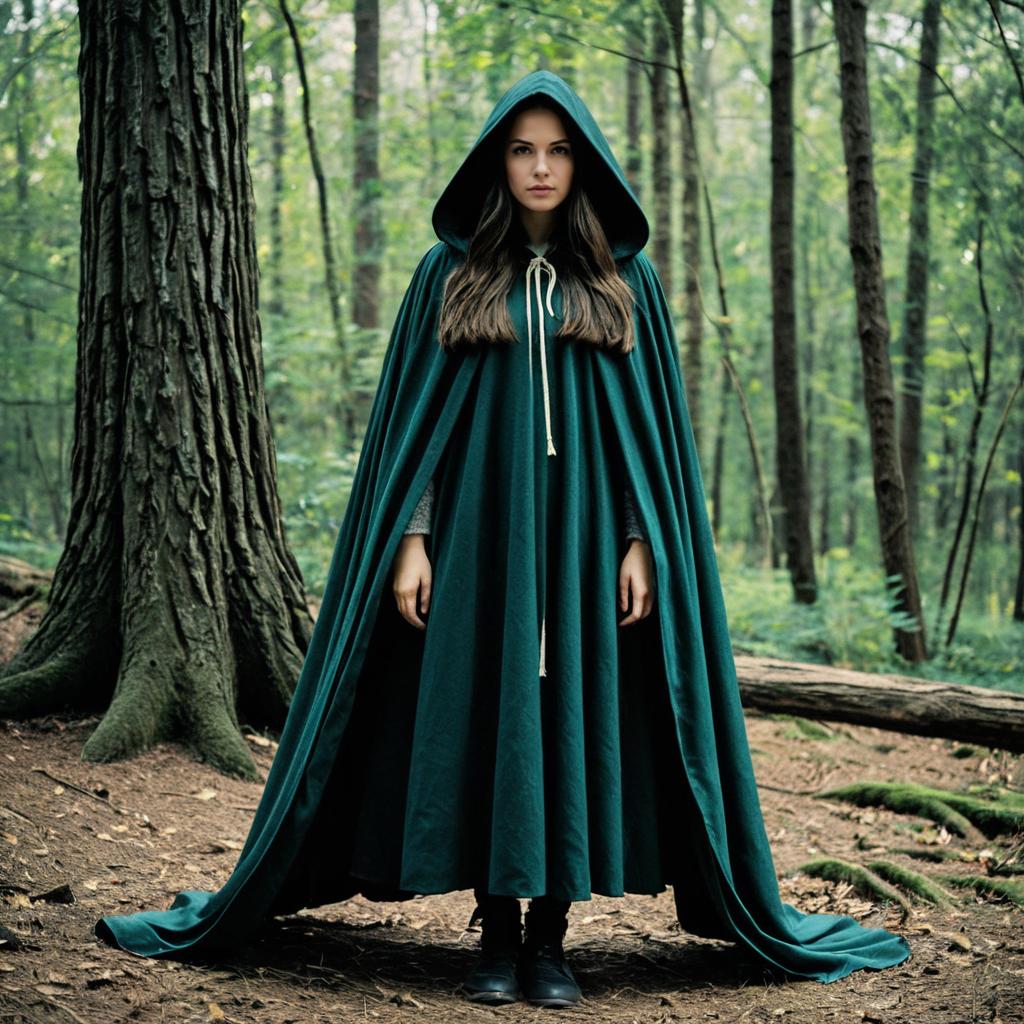 Woman in Hooded Cloak in Forest