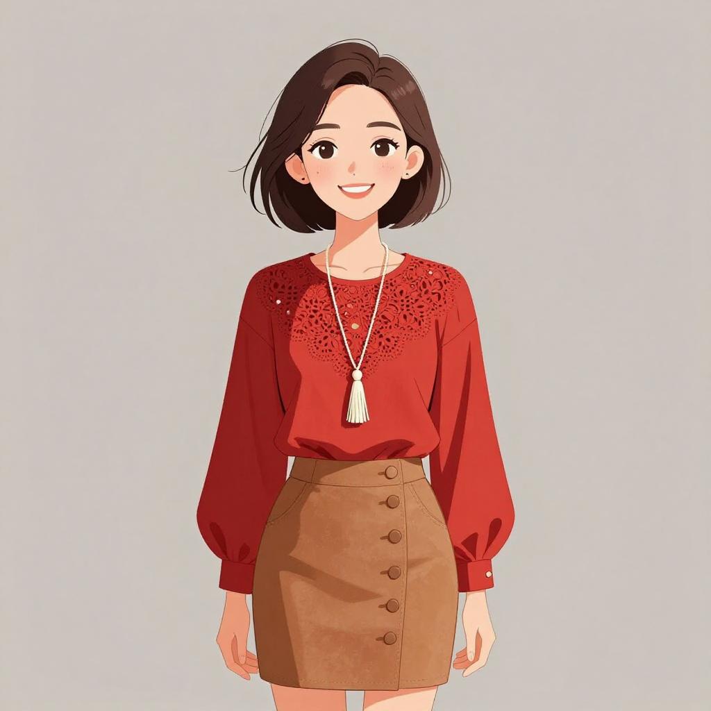 Woman with pretty face and pretty hair. smiling Woman, casual chic, crimson blouse with lace detailing on the upper chest, round neckline, long sleeves with buttoned cuffs, tucked into a caramel-colored suede mini skirt with front button fastenings, accessorized with a long white tassel necklace. --sref 1467