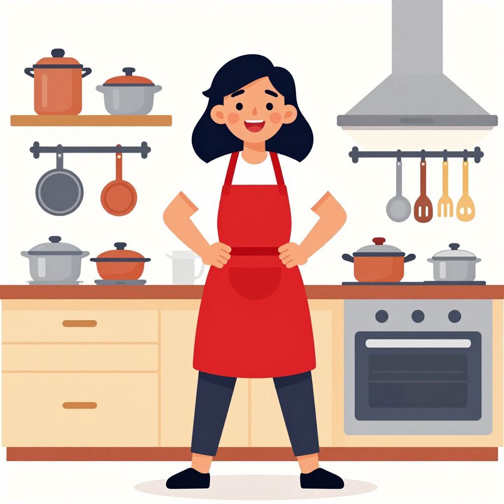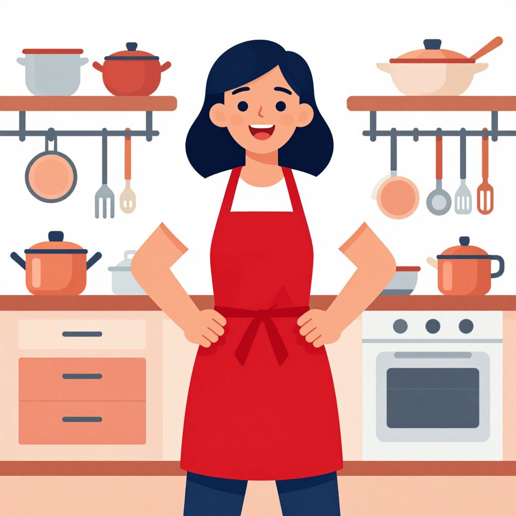 A vibrant cartoon-style vector illustration depicts a cheerful woman in a red apron standing confidently in a cozy kitchen, surrounded by neatly arranged cookware and utensils, embodying the essence of a domestic superhero.