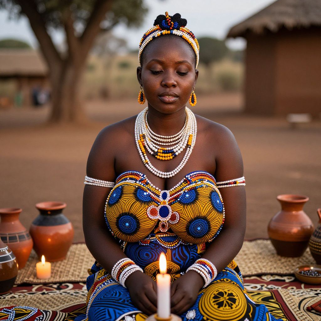 Photograph of a dark-skinned African woman with a serene expression, seated outdoors on a woven mat. She wears an elaborate, colorful beaded dress with blue, yellow, and orange patterns, and multiple white beaded necklaces and armlets. Her hair is adorned with black beads. In front of her are lit candles and several clay pots. The background shows a blurry, rural setting with a tree and a thatched hut. The image has vibrant colors and a rich cultural texture.