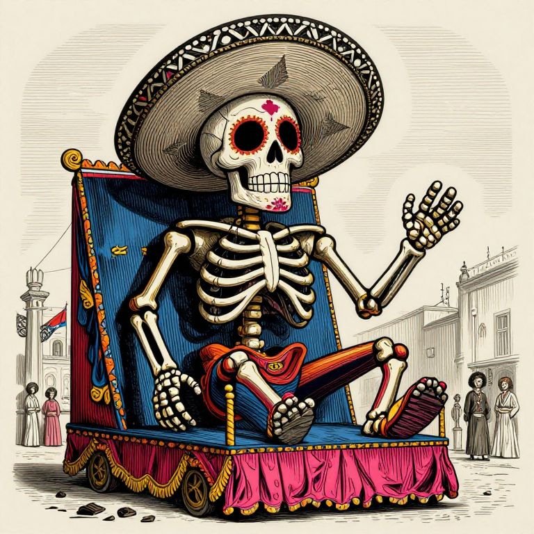 Bump Map large mexican parade float for Day of the Dead, surreal silly skeleton defying death, 19th century colored engravig,