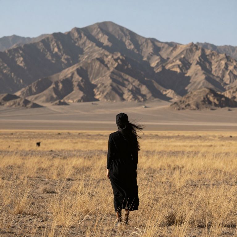 A solitary woman dressed in a long black dress and headscarf stands in a dry, grassy desert landscape with rugged brown mountains in the background under a clear sky. Her hair is blowing slightly in the wind, emphasizing the vast open space and natural solitude.