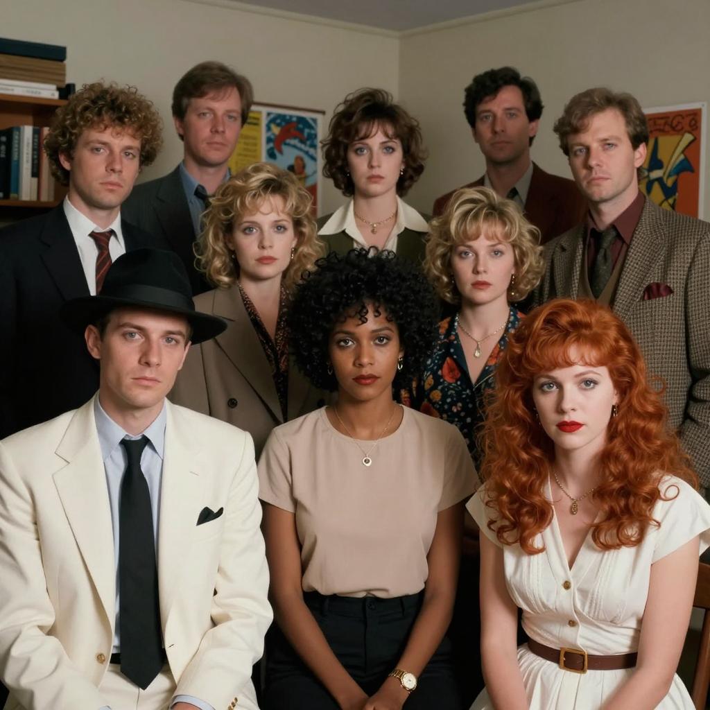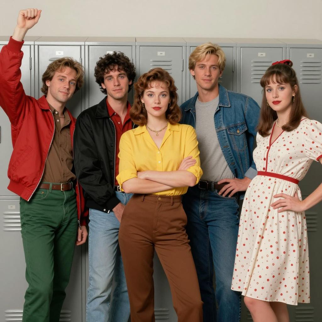 Group of six people standing in front of gray lockers. Man on left in red jacket, brown shirt, and green pants, arm raised. Next man in red shirt, black jacket, hands clasped. Woman in yellow top, brown pants, necklace, arms crossed. Blonde man in gray shirt, blue jacket, hands on hips. Woman on right in white dress with red cherry pattern, brown hair, hand on belly. Lockers in background. Casual, 1980s style.