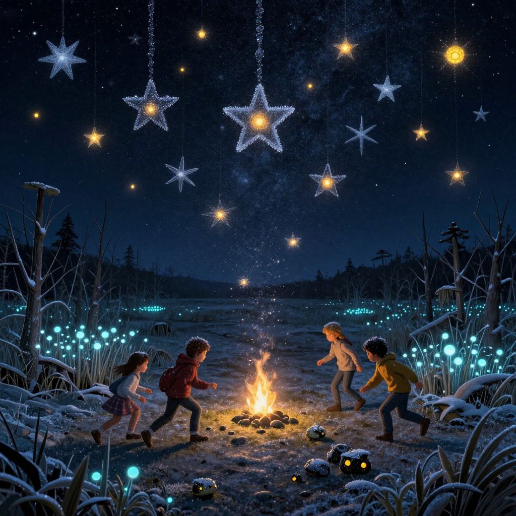 This digital illustration depicts a nighttime winter scene featuring four children gathered around a campfire in a snow-covered field. The children, dressed in winter clothes, are standing on either side of the fire, facing each other. The background showcases a dark, starry sky with glowing, illuminated stars and a string of larger, sparkling stars hanging above. Blue, glowing lights are scattered among the snow-covered grasses on either side of the fire. The campfire's warm, orange glow contrasts with the cool, dark blue and black hues of the night sky and snow. The children's excited expressions and dynamic poses suggest they are sharing a joyful moment.
