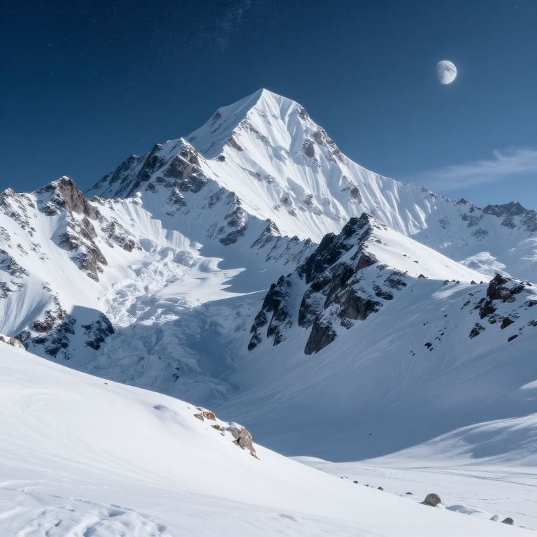 Photograph of a majestic, snow-covered mountain peak under a clear, deep blue night sky. The bright full moon is visible in the upper right corner, casting a gentle light on the rugged, jagged mountain. The snow on the mountain is pristine and glistening, with sharp shadows highlighting its texture. Dark rocky outcrops punctuate the otherwise smooth, white landscape. The foreground features a gently sloping snowfield leading up to the towering peak, creating a sense of depth and scale. The overall scene is serene and awe-inspiring, capturing the quiet beauty of a winter night in the mountains.