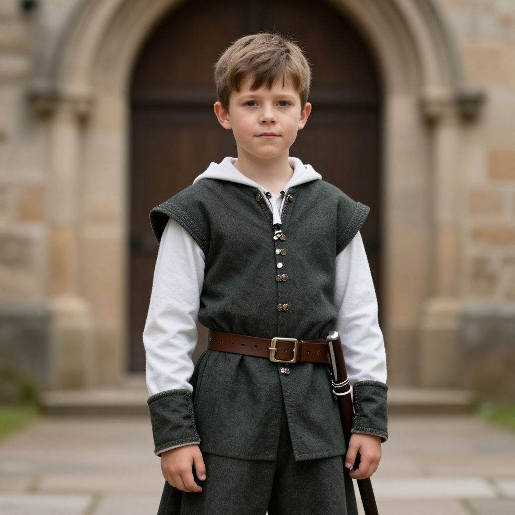 Highlander Costume Boy, boy dressed in medieval clothing standing in front of a building