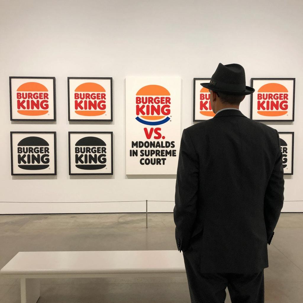 A man in a dark suit and fedora stands with his back to the camera, facing an art gallery wall. The wall displays several rectangular signs with red and black , and a central sign reads "BURGER KING VS. McDONALD'S IN SUPREME COURT". White benches are positioned in the foreground. The gallery has white walls and a concrete floor. The man stands in the right foreground, while the wall is in the background.