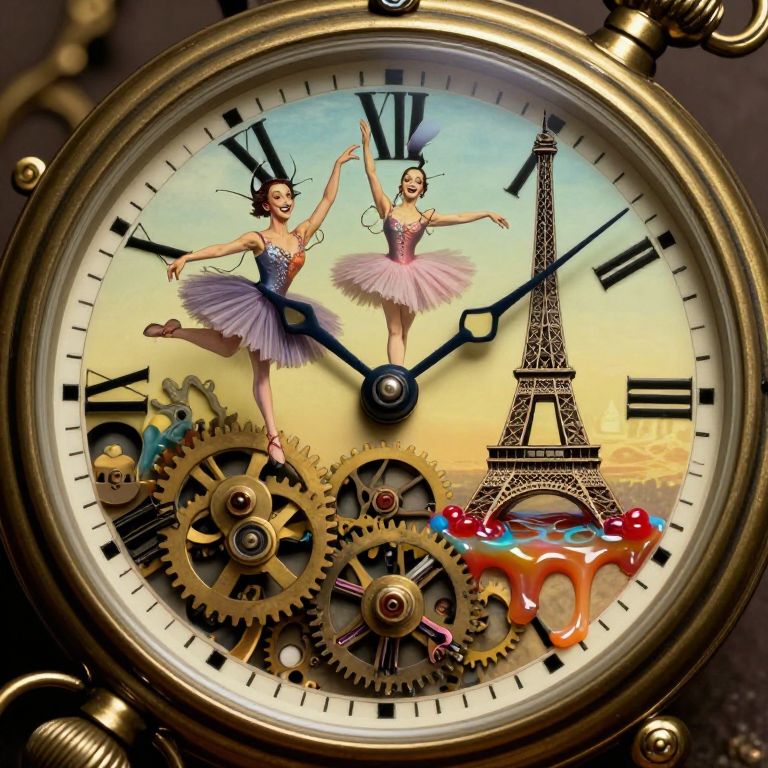 Craft an image embodying surreal dreamscapes reminiscent of Dali's iconic works, portraying a fantastical scene from inside a vintage pocket watch as observed through the lens of an insect. Amidst the labyrinthine gears and cogs, visualize whimsical figures morphed from clock hands performing a haunting ballet on the watch's inner chamber. These enigmatic dancers sport mischievous grins while pirouetting around a miniature Eiffel Tower crafted from liquefied confectionery, striking a balance between enchantment and apprehension in this surreal tableau within mechanical confines. The image should evoke an emotional spectrum ranging from lighthearted delight to unsettling unease, encapsulating Dali's distinctive fusion of fantasy and foreboding within the pocket watch's microcosm.