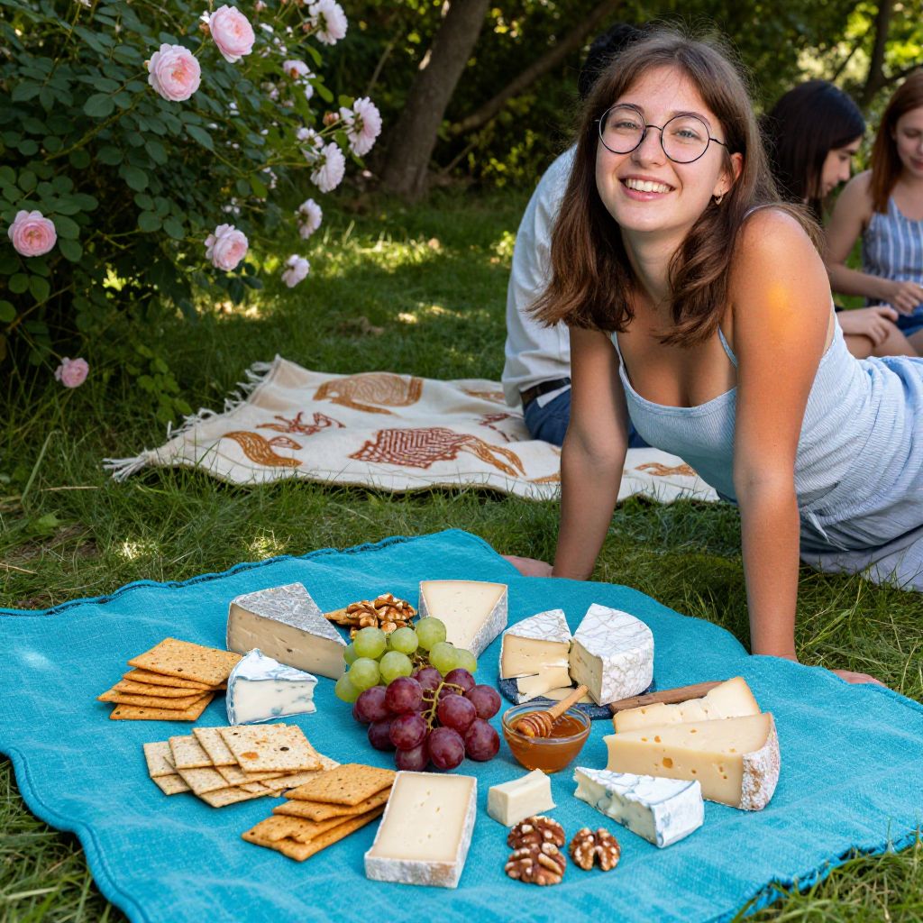 A festive cheese platter laid out on a bright blue linen cloth at a backyard summer picnic, featuring a mix of soft and hard cheeses, crackers, grapes, and honey-drizzled walnuts. The setting is warm and natural, with green grass, blooming roses, and a vintage picnic blanket in the background. A cheerful young woman with round glasses and a sun-kissed face stands beside it, laughing with friends in the distance.
