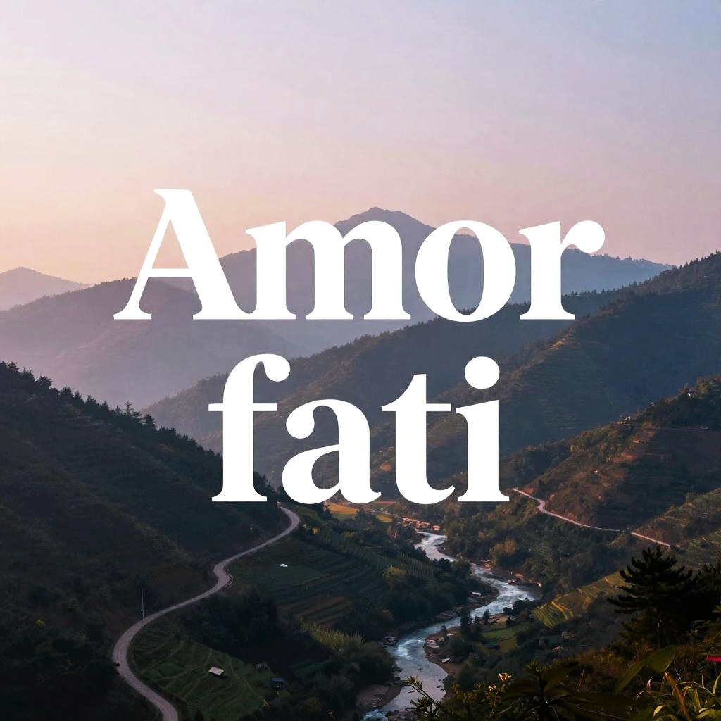 Photograph of a mountainous landscape at sunset with a winding river, overlaid with bold white text reading "Amor fati."