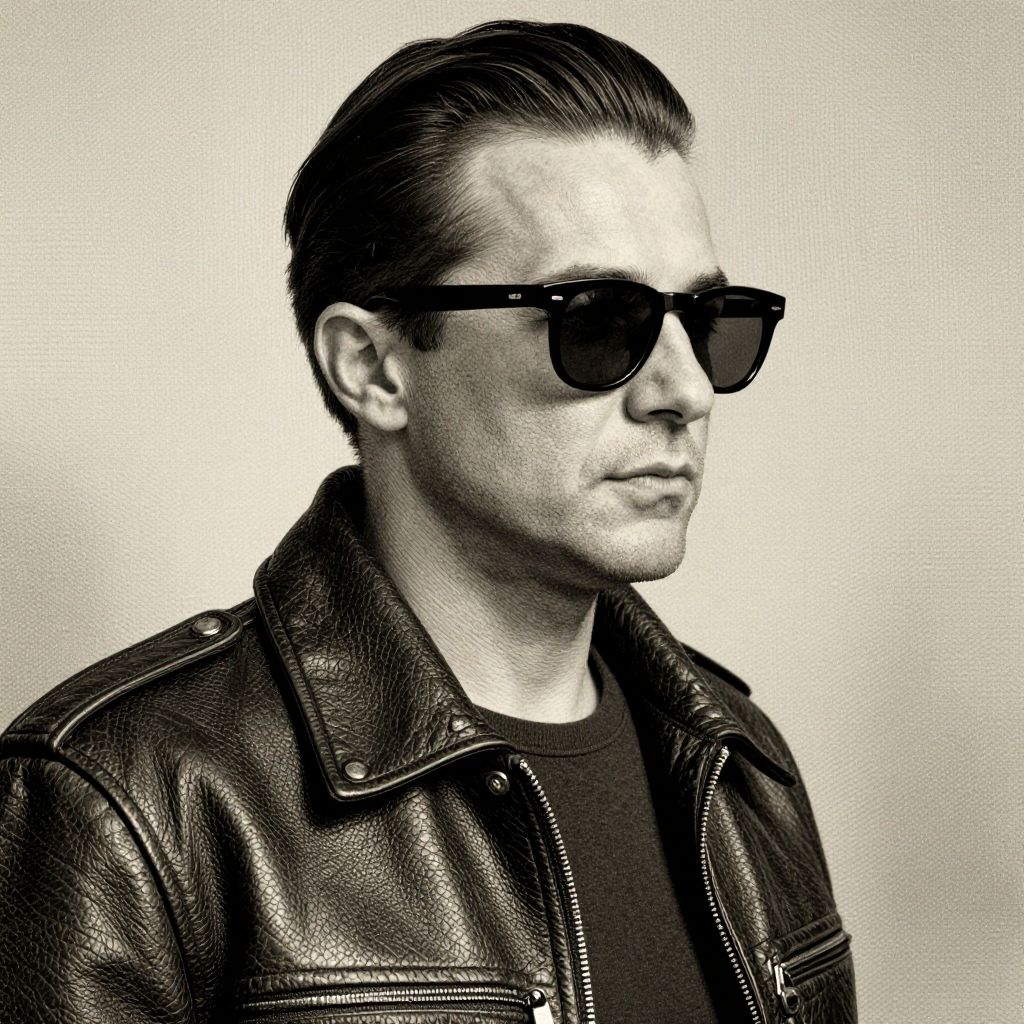 A high-definition digital engraving-style portrait of a man with a classic, retro aesthetic, featuring detailed hair texture, a sharp suit collar, and a dramatic side profile accentuated by bold sunglasses and subtle facial stubble.