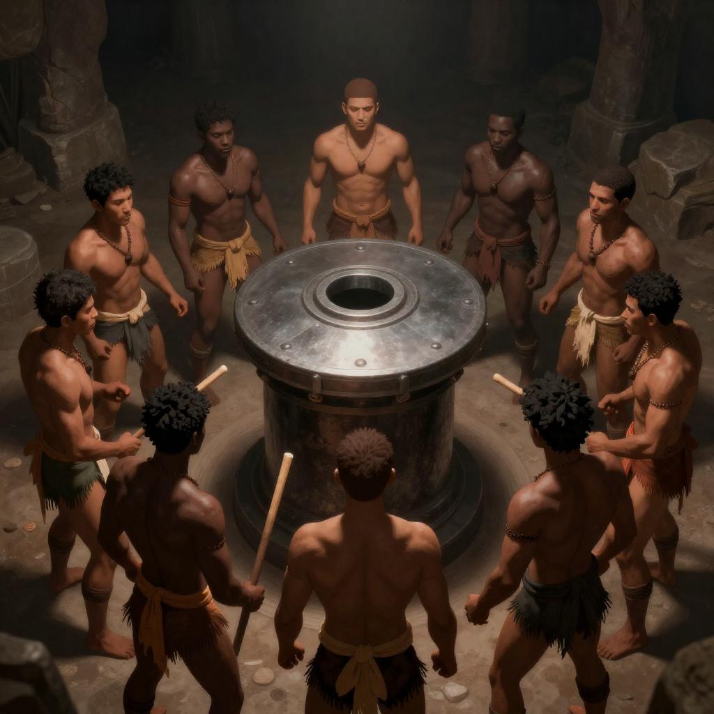 Digital illustration of a group of shirtless, muscular men with dark skin and loincloths, circling around a large, central, cylindrical machine with a metal top. The background features a dimly lit, cave-like setting with stone ures. The men hold wooden sticks, and their expressions are focused. The machine is centered, with the men forming a semi-circle around it.