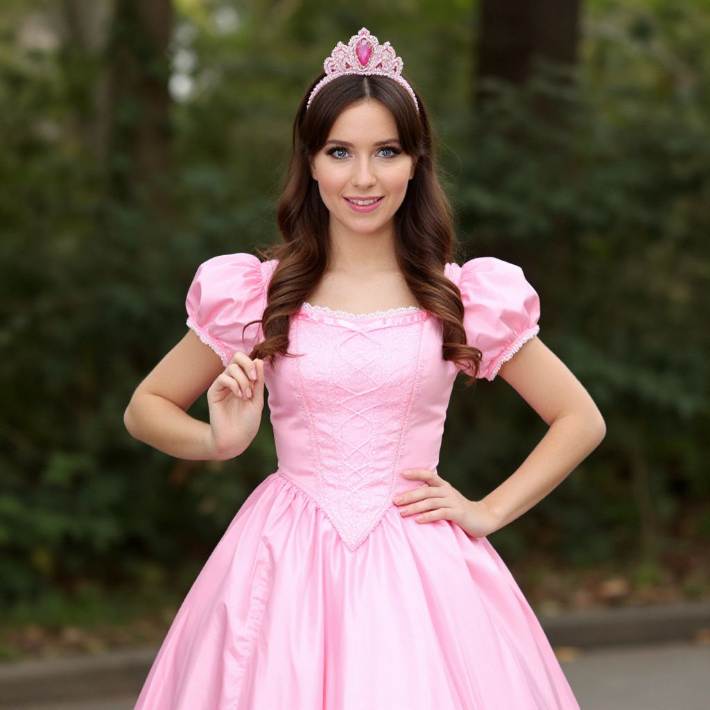 Photograph of a smiling young woman with long brown hair, wearing a pink princess dress, puffed sleeves, and a silver tiara, standing outdoors