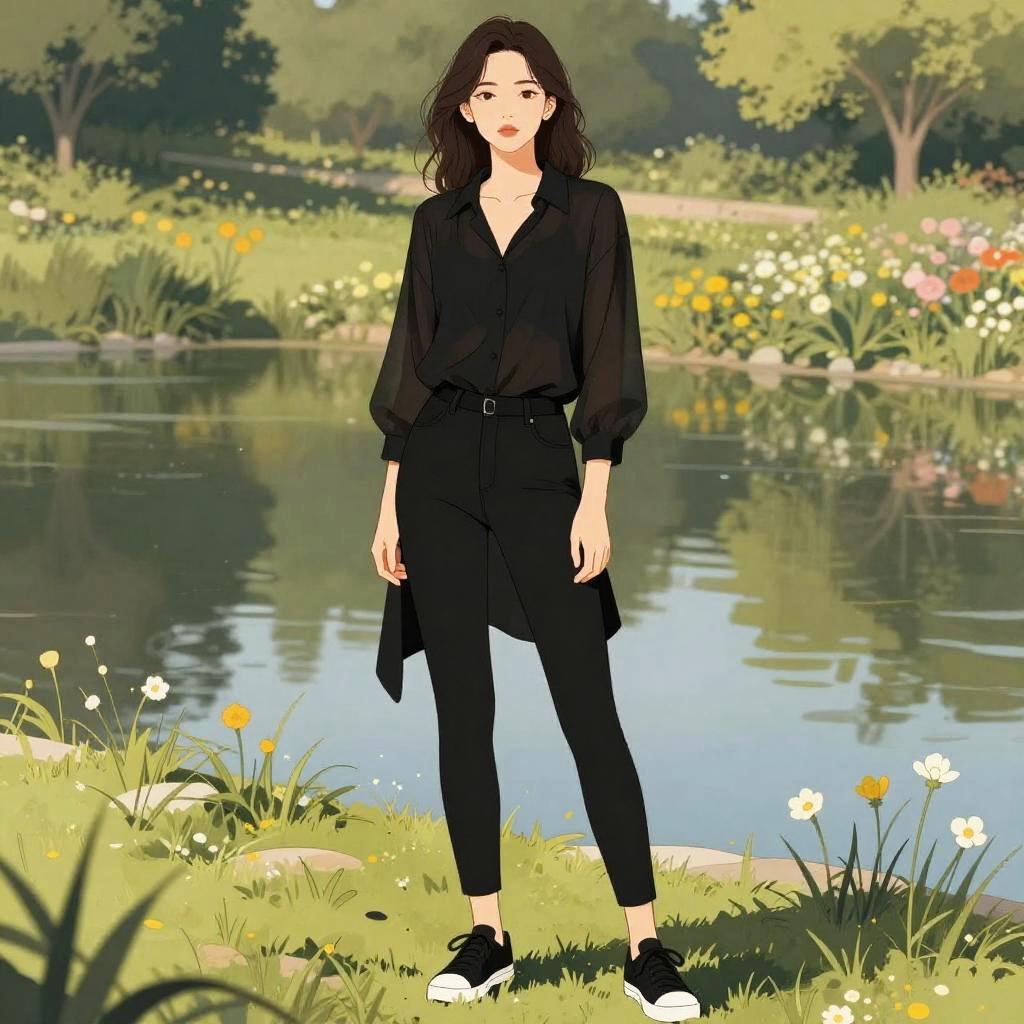 A woman in a casual striped t-shirt dress, black and white, with short sleeves and a round neckline, minimalist jewelry, standing in a city park flower garden, illustrated in the style of Titan Books. Sexy. Pretty face and beutiful eyes