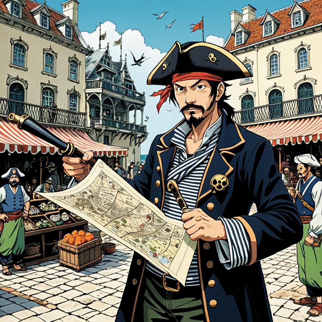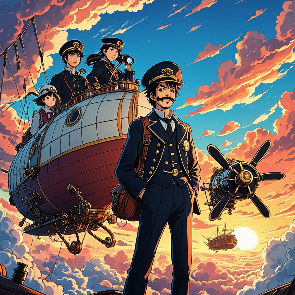An eccentric airship crew, featuring a jovial captain with a monocle, a sharp-eyed lookout with binoculars, a quirky mechanic with a steam-powered backpack, engaged in an intense skirmish against sky pirates, set against a vibrant sunset sky with drifting clouds, drawn in the whimsical and action-packed anime style of Eiichiro Oda.