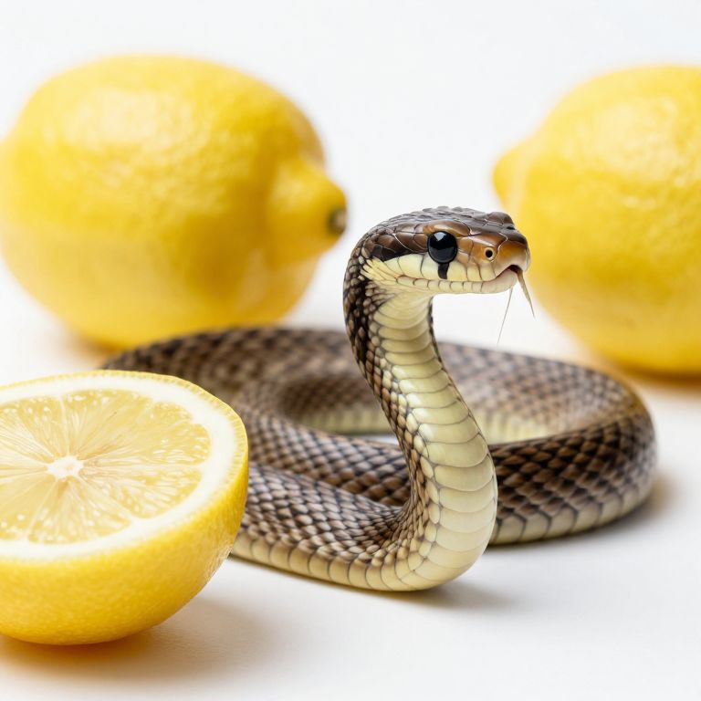A high-contrast photograph of a coiled, brown and black patterned snake with a glossy, forked tongue, positioned in the center. The snake's scales are detailed and textured. Surrounding the snake are three bright yellow lemons, one sliced in half revealing its juicy interior, positioned in the foreground and background. The background is a clean, white, and slightly out-of-focus, emphasizing the snake and lemons. The image has a sharp focus on the snake's head and body, highlighting its alert expression and intricate scale patterns.