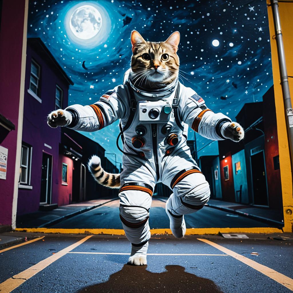 A levitating cat wearing a spacesuit posed on a colorful street mural, blending surrealism and photorealism with hyperdetailed textures, lit by ethereal moonlight, front view, sharp focus, cinematic shot, captured on Sony PMW-F55 with Sony FE 90 mm f/2.8 Macro G OSS lens.