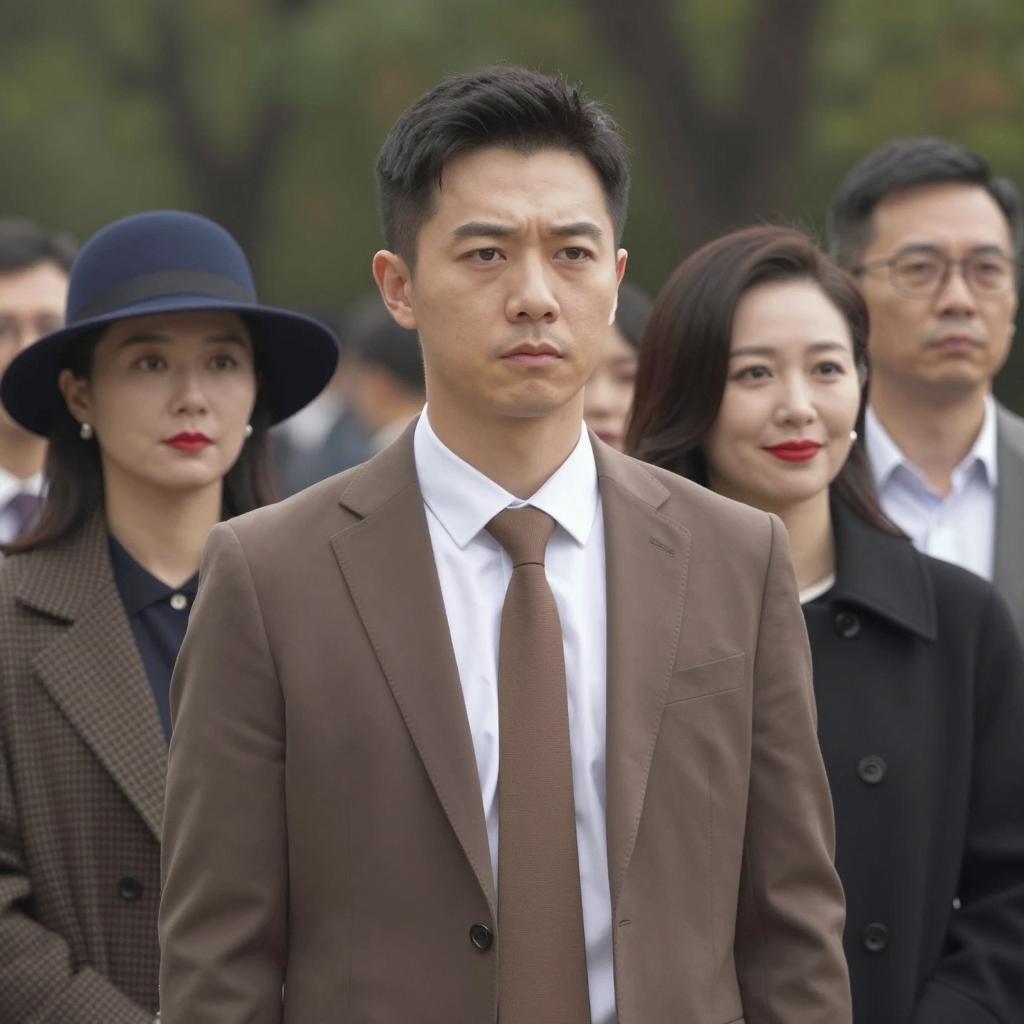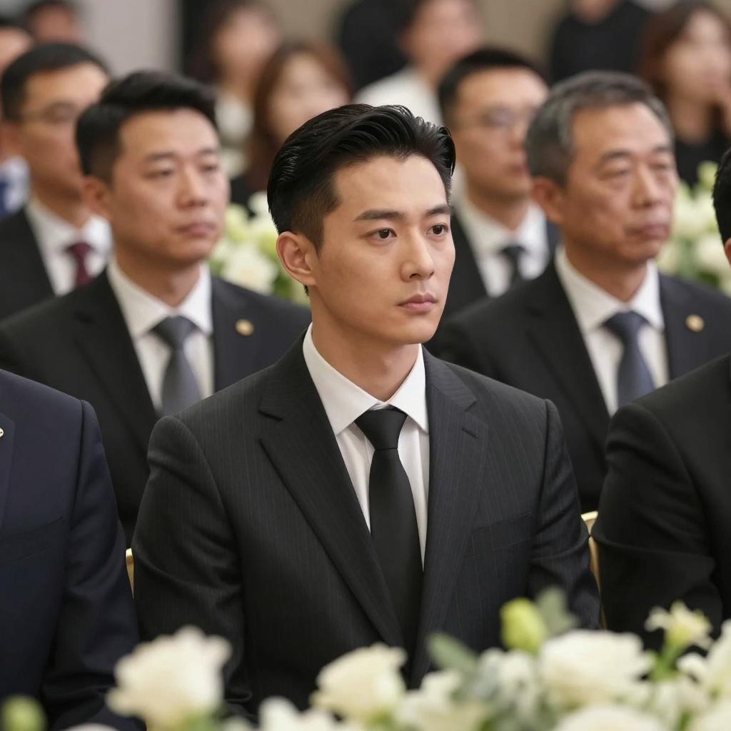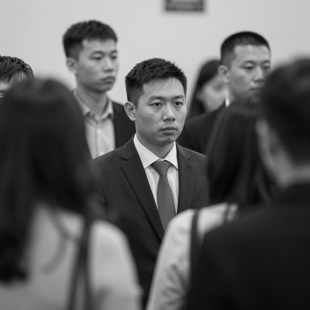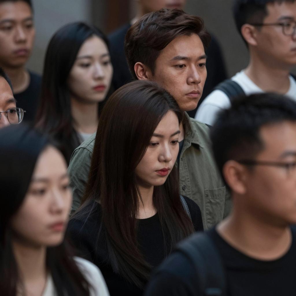 Photograph of a large crowd in a dimly lit, yellow-hued room. People stand closely together, some in suits, others in dresses, with varied expressions. Background has indistinct figures and a bright light source above. Crowded, tense atmosphere.