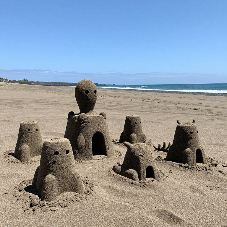 Sand castles shaped like aliens and extinct species rise overnight on a silent volcanic beach, only to vanish by noon with the heat.