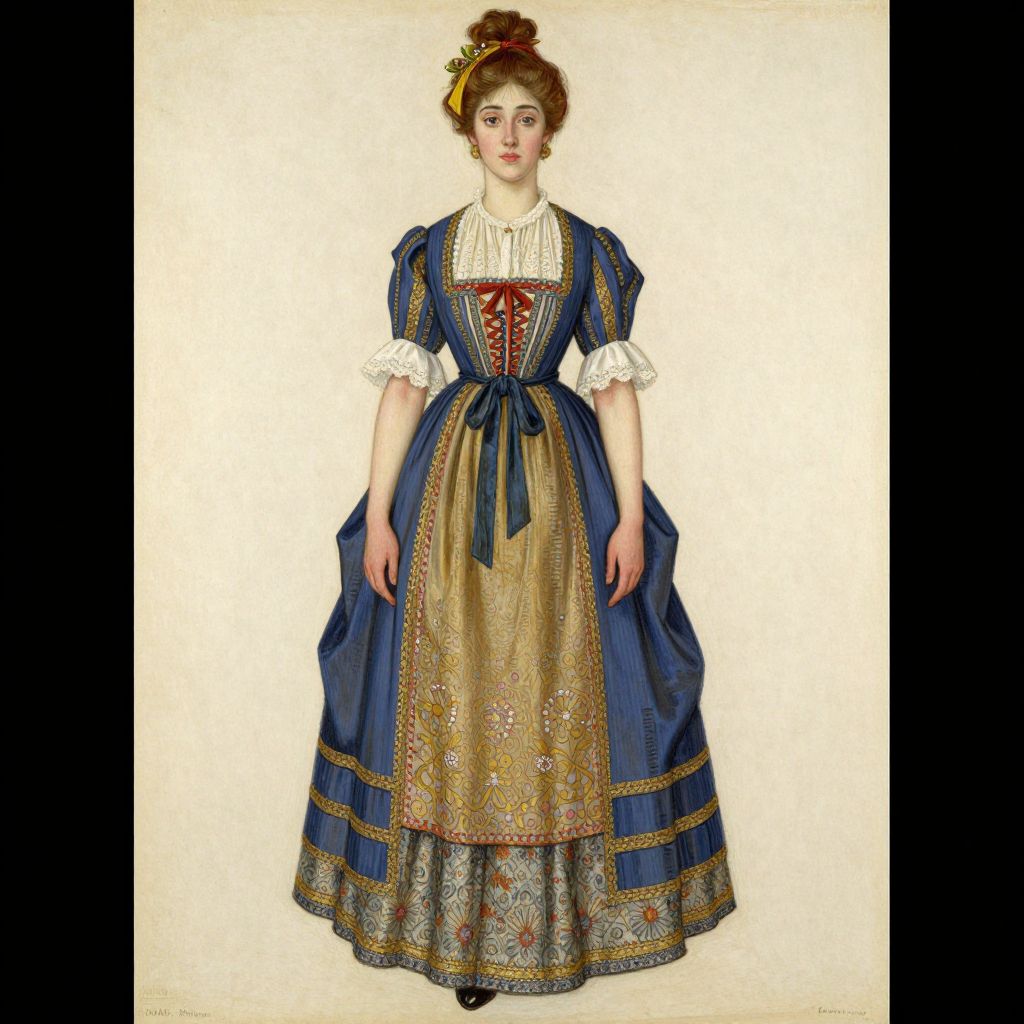 Photograph of a fair-skinned woman with brown hair in an updo, wearing a 19th-century blue and gold brocade dress with white