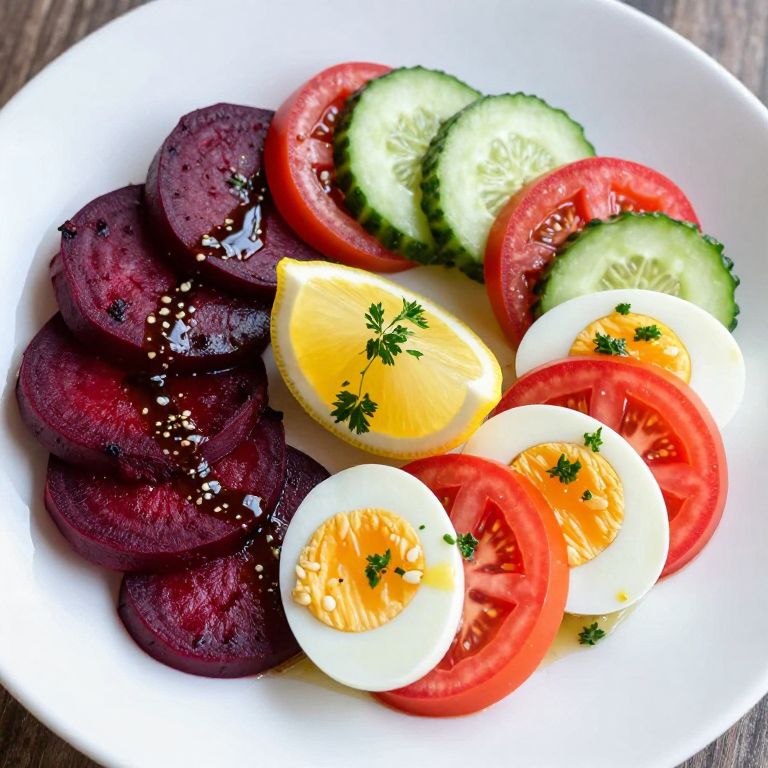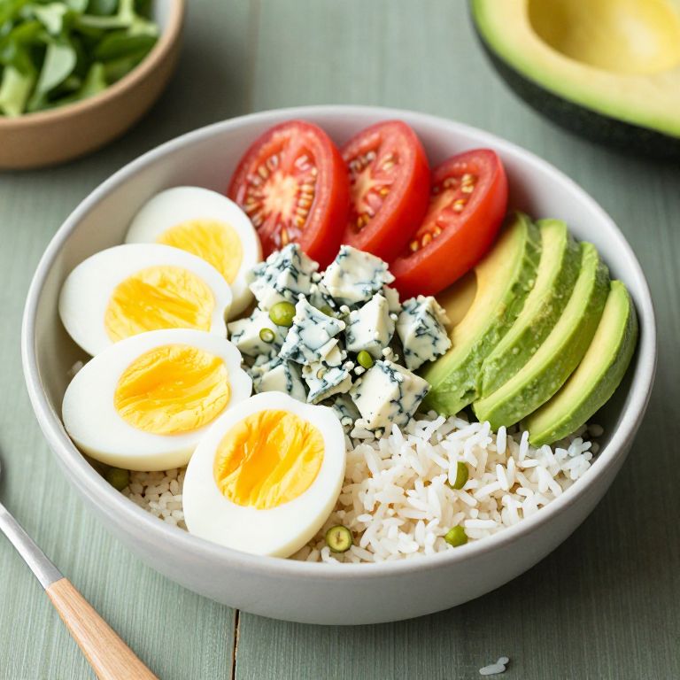 Bowl of vibrant comfort food featuring a golden-brown burger patty topped with green onions, nestled atop a bed of dark grains, surrounded by halved hard-boiled eggs, sliced cucumbers, and carrot sticks, served in a pristine white bowl on a wooden table.