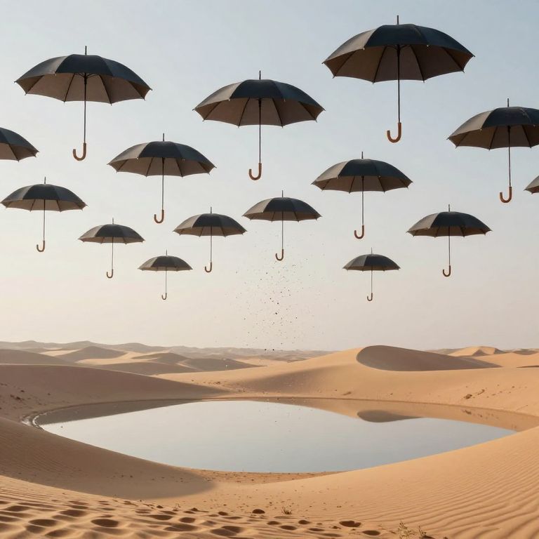 Suspended between dream and reality, a city of floating umbrellas hovers above an inverted desert, its mirrored sands reflecting an ethereal solitude, while cascading particles evoke a sense of transience and the quiet mystery of existence.
