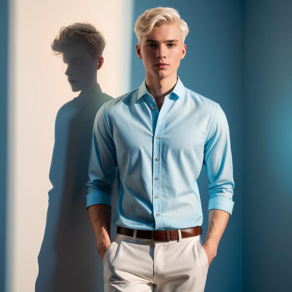 A confident young man with short platinum blonde hair wearing a light blue, slightly wrinkled shirt and white pants, standing in a room with dramatic warm lighting and strong shadow patterns on the wall, modern minimalist aesthetic, natural skin color, realistic textures, focused expression