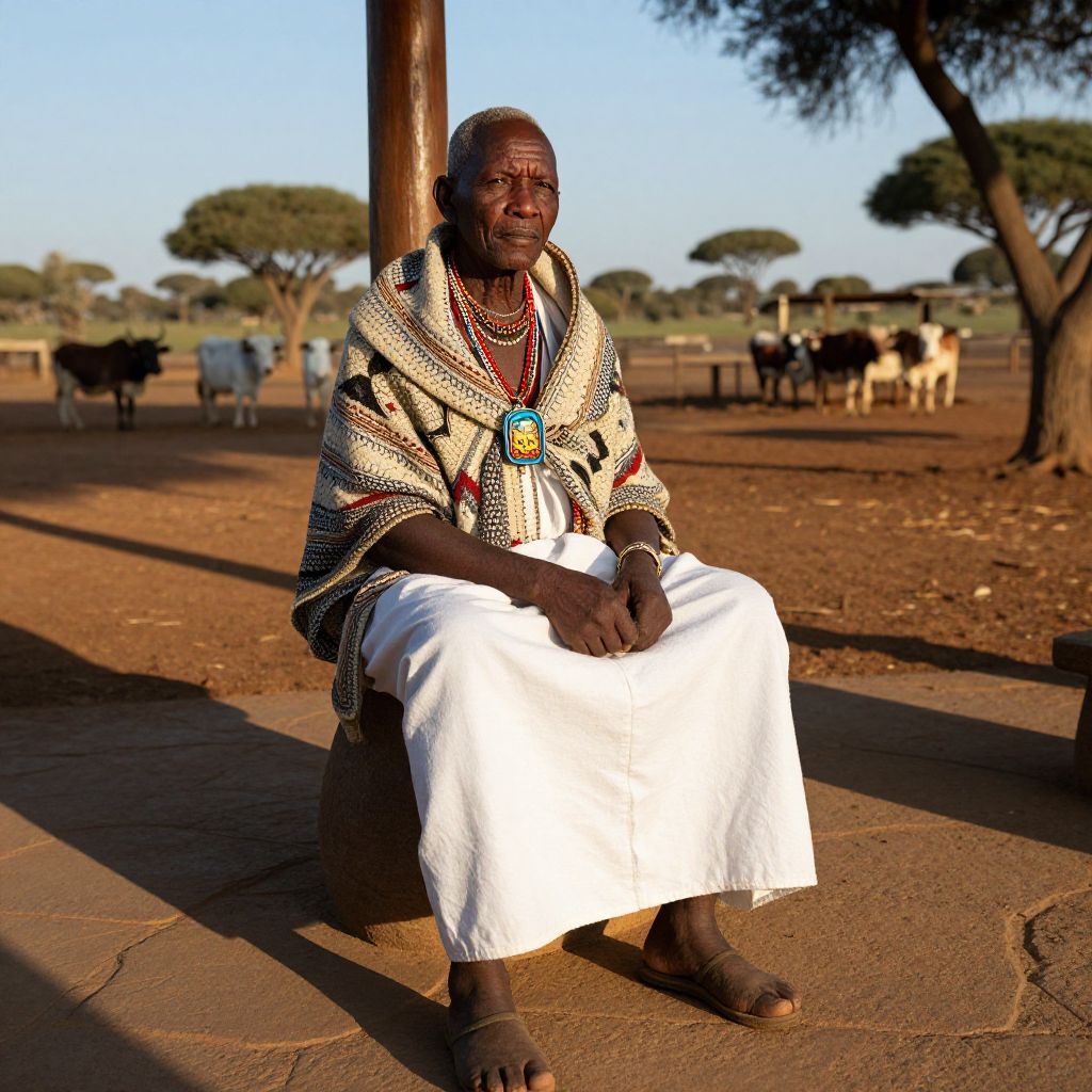 A detailed portrait of an elderly Xhosa man dressed in traditional South African costume, including a hand-woven isiXhosa wrap, a wide white kanga, and a traditional neck pendant, sitting on a stone patio in a rural village near Pretoria, with the golden afternoon sun casting long shadows and a nearby cattle farm visible.