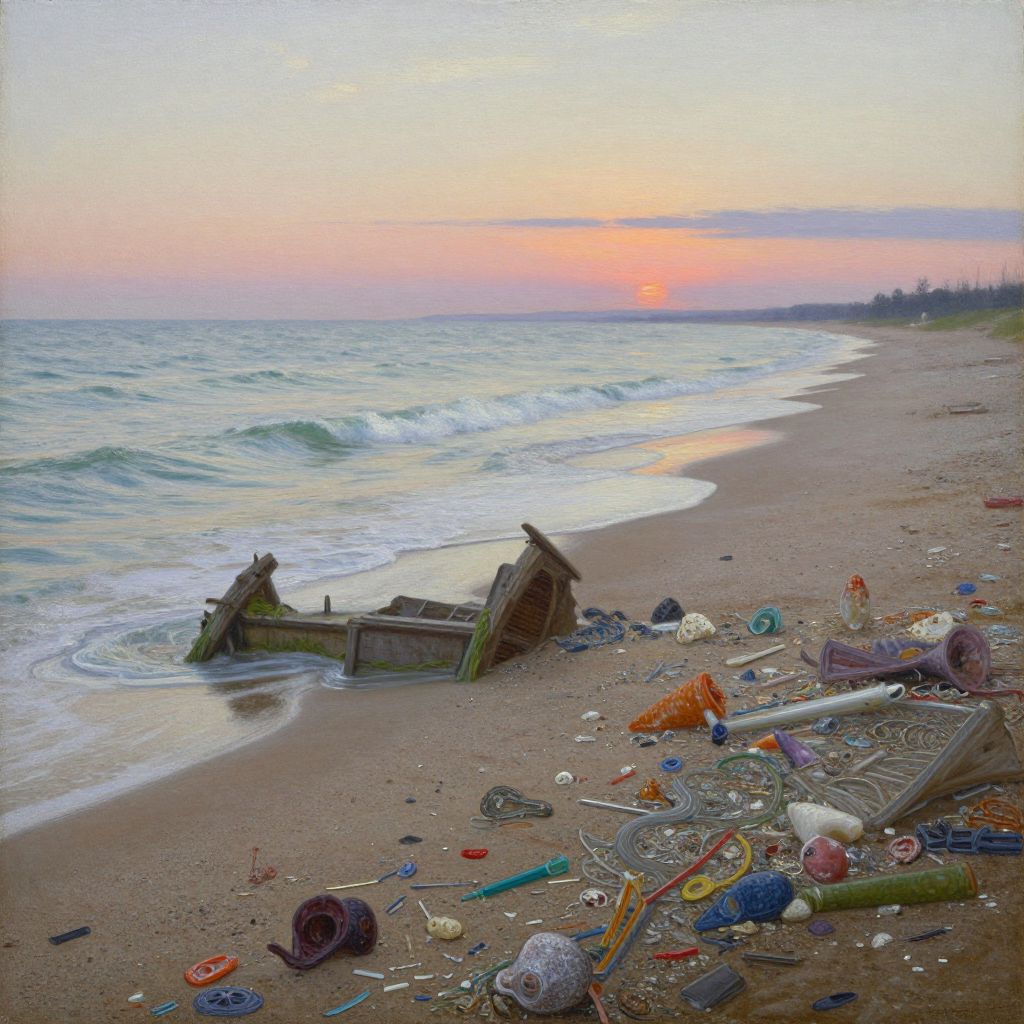 An oil painting capturing the serene beauty of a coastal landscape where tranquil waves caress a solitary beach, revealing fragments of forgotten structures partially engulfed by the advancing tide. Employing an insect's viewpoint, this artwork intricately details the intricate designs within the diverse marine debris strewn along the shoreline. As dawn bathes the horizon in gentle hues, the composition artfully combines the poignant elegance of erosion with the awe-inspiring vitality of nature, evoking a spectrum of emotions through the interwoven tapestry of color, texture, and light that mirrors the mastery of Ivan Shishkin's works, without directly referencing him.