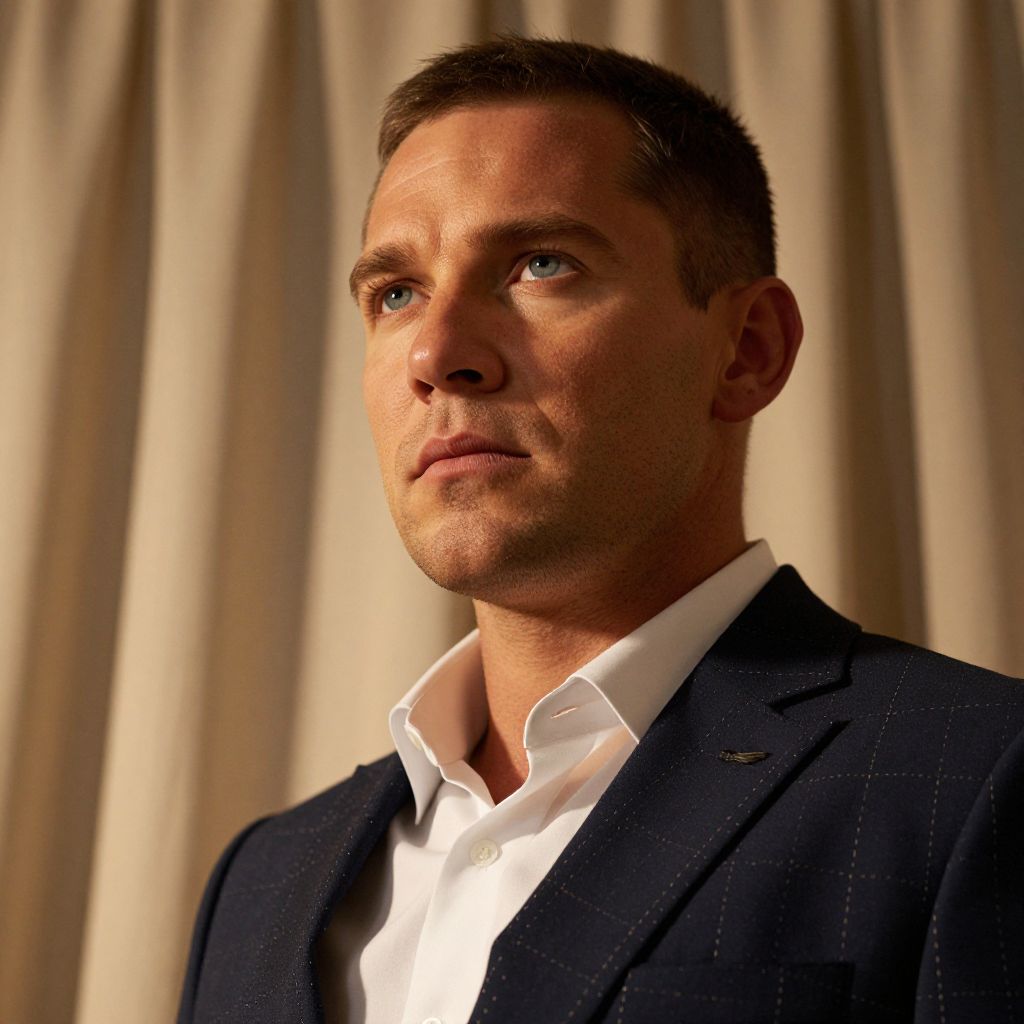 Photograph of a Caucasian man with short, dark brown hair and blue eyes, standing against a beige, vertically-striped curtain background. He wears a dark, checkered blazer over a crisp, white dress shirt, with the collar slightly unbuttoned. His expression is serious and contemplative, with a slight squint in his eyes. The lighting is warm, highlighting his facial features and the texture of his blazer. The image has a slightly grainy texture, adding a subtle vintage feel. The man is positioned slightly to the left, with his head turned slightly to the right.