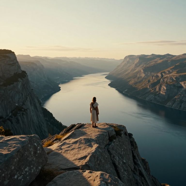 Create an evocative landscape infused with romanticism, portraying a solitary figure dressed in ancient Greek attire standing atop a grand cliff overlooking a tranquil fjord. From a unique 'bug's-eye view' perspective, the figure appears small yet significant amidst the expansive natural splendor, radiating profound contemplation and harmony with their surroundings. The scene is illuminated by soft golden hour light that enhances the ethereal ambiance of the setting, casting elongated shadows over jagged rocks and calm waters, invoking a spectrum of serene introspection within this awe-inspiring panorama.